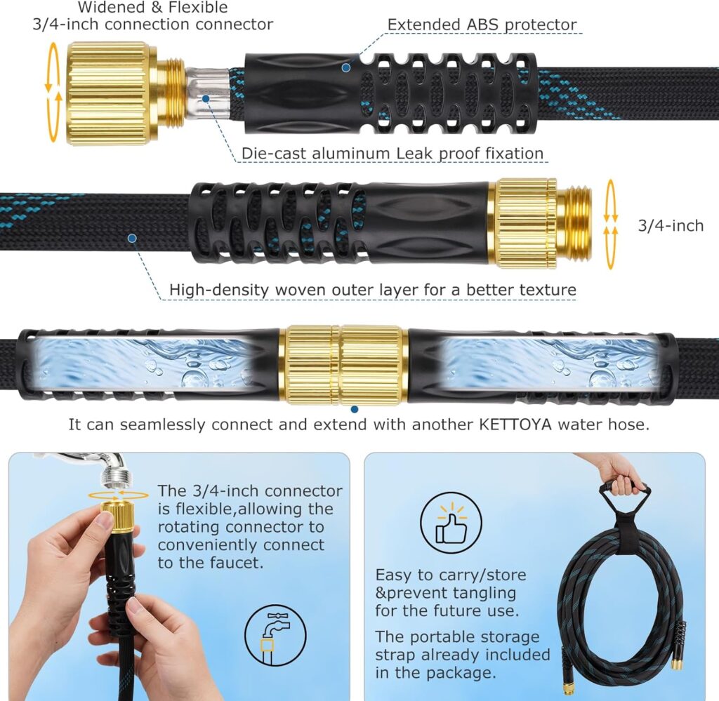 The KETTOYA garden hose is a 100-foot, non-expandable hose designed to be flexible, lightweight, and kink-resistant. It’s meant for anyone who waters gardens, cleans outdoor areas, or needs a reliable hose for frequent use. Unlike typical expandable hoses, it stays compact without ballooning, offering a fresh approach for garden enthusiasts and homeowners wanting hassle-free watering.